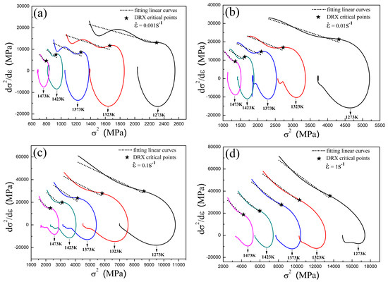 vs. plots derived from the true stress-strain curves of Armco-type pure iron: (a) = 0.001 s−1; (b) = 0.01 s−1; (c) = 0.1 s−1; and (d) = 1 s−1. The part before the DRX critical point of each curve refers to the DRV process and is fitted by the linear curve of the dot line. These linear curves are employed to determine the values of and . The method to determine the DRX critical points will be discussed later.