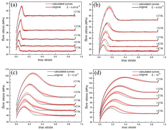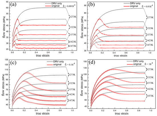 Original true stress-strain curves and calculated flow stress curves considering eDRV and DRX processes of Armco-type pure iron: (a) = 0.001 s−1; (b) = 0.01 s−1; (c) = 0.1 s−1; and (d) = 1 s−1. The red solid curves are the original true stress-strain curves while the dot lines are the flow stress curves calculated through Equation (23).