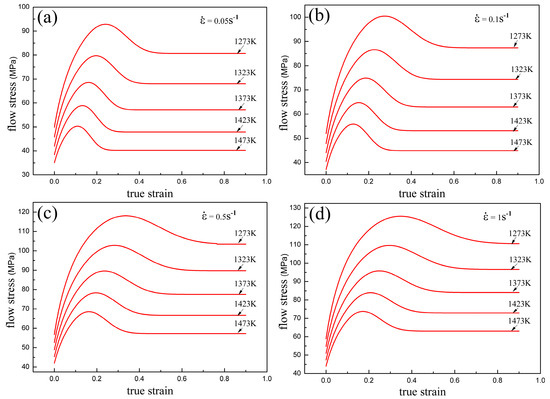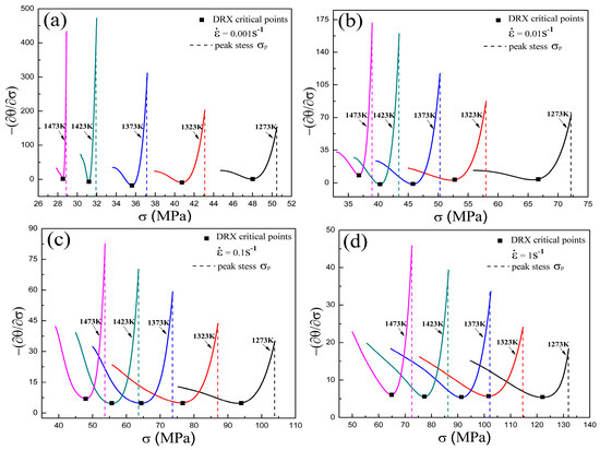 vs. curves of Armco-type pure iron: (a) = 0.001 s−1; (b) = 0.01 s−1; (c) = 0.1 s−1; and (d) = 1 s−1. According to the Poliak method, the DRX critical point is supposed to be the peak point of each curve [30]. The dashed lines correspond to the peak stresses of each curve.