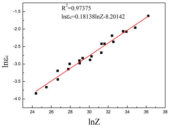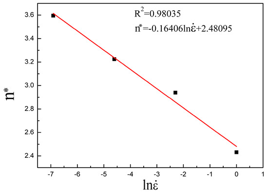As shown in Figure 8, the values of the slope are nearly the same when in the same strain rates; meanwhile, the temperatures show no obvious effects. Here, the average values of for strain rates of 0.001 s−1, 0.01 s−1, 0.1 s−1 and 1 s−1 are 3.595144, 3.224808, 2.939272 and 2.43113, respectively. The relation between the average values and shown in Figure 9 is employed to determine the expression: . Through a linear fitting, is obtained as follows: