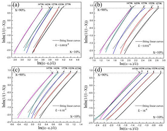 As discussed above, through some proper modifications presented in Equation (11), the Avrami equation can be used to describe the DRX process. When using the modified Avrami equation for the DRX process, the expressions of and must be determined. Taking the natural logarithm twice on both sides of Equation (11), the following can be obtained: