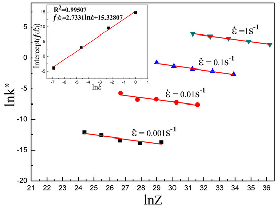 The relationship between the Z parameter and . These linear curves are obtained from the linear fitting of points with the same strain rates. Here, the parameter is in the form of . Insert: the relationship between and the intercepts of these linear fitting curves.