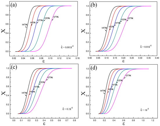 S-curves of Armco-type pure iron calculated by Equation (22): (a) = 0.001 s−1; (b) = 0.01 s−1; (c) = 0.1 s−1; and (d) = 1 s−1.