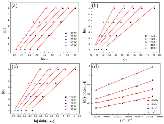 vs. curves of Armco-type pure iron: (a) = 0.001 s−1; (b) = 0.01 s−1; (c) = 0.1 s−1; and (d) = 1 s−1. The values of are calculated out through Equation (16). The dot lines are the linear fitting results of each curve. After the linear fitting, and are obtained as the slope and intercept, respectively.