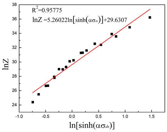 The stress multiplier is defined as: . As proposed by Mandal et al. and Lin et al., Equation (24) is preferred for a low strain level where < 0.8, while Equation (25) is preferred for a high strain level where > 1.2 [33,34]. The sine-hyperbolic equation of Equation (26), proposed by Sellars et al., is widely employed to describe the relationship between flow stress, strain rate and deformation temperature over a wide range of stresses [14]. Therefore, Equation (26) is used to describe the flow behavior of the steady state in this work. According to Equation (26), the constitutive model for part III can be expressed as follow: