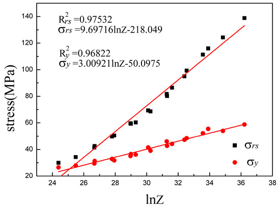 The values of presented in the Supplementary Materials of Table S1, and the corresponding strain rates and temperatures, are used to determine the values of these constants. As shown in Figure 13, using the linear regression of these data, the values of , and obtained as the average slopes of -, - and -, are 7.37182, 0.13345 and 5.50432, respectively. Meanwhile, the value of obtained as the average value of is 0.01777, and the value of calculated based on the average slopes of - is 383094 J mol−1. The activation energy of Armco-type pure iron is lower than that of other steels, and this is mainly caused by the high Fe atom purity. Alloy elements in other steels usually decrease the mobility of Fe atoms and thus increase the value of . According to the calculated value of , the Z parameter for Armco-type pure iron can be expressed as follows:
