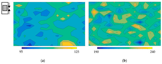 Microhardness mapping of Fe-30Ni material in (a) homogenized and (b) deformed to 0.3 strain at room temperature conditions, step size 0.5 mm. (Examination area 3.5 mm × 7 mm). Inset diagram: Arrows show the compression direction for the 15 mm height; 10 mm diameter samples and the shadowed region shows the examination area.