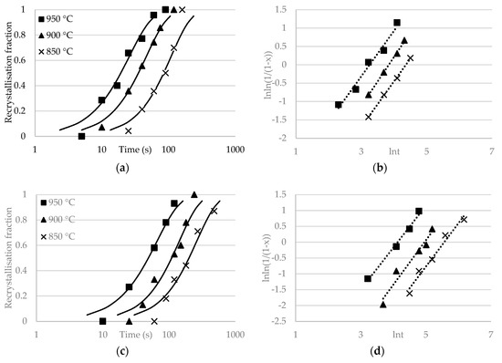 Recrystallisation kinetics and double log diagram for 160 µm mode grain size samples deformed to (a,b) 0.3 strain and (c,d) 0.2 strain at room temperature, then annealed at three temperatures (850, 900 and 950 °C).