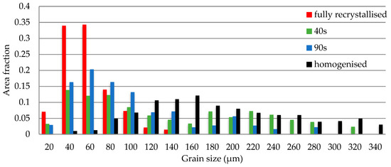 The grain size distribution of homogenised, 40 s (30% recrystallised), 90 s, (50% recrystallised) and fully recrystallised samples.