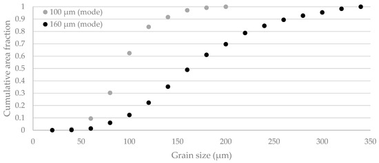 Cumulative area fraction representation of grain size for the two different grain size distributions.