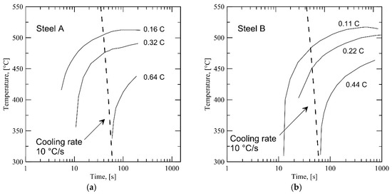 Partial CCT (continuous cooling transformation) curves showing the bainite start lines, calculated for (a) Steel A and (b) Steel B (see Table 1 for compositions), assuming full partitioning of carbon from ferrite to austenite during intercritical annealing. The carbon concentration for each annealing condition is indicated in wt % next to the corresponding bainite start line.