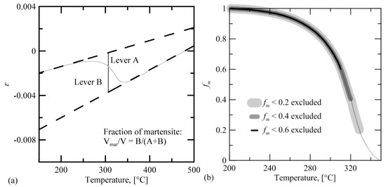 (a) The cooling contraction curve around the martensitic transformation. (b) The martensite volume fraction with respect to temperature extrapolated from the data shown in (a).