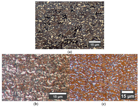Typical examples of the optical micrographs of the dilatometry specimens for (a) Steel A, (b) Steel B and (c) Steel C.