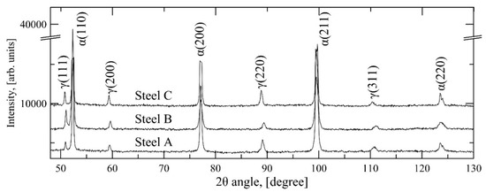 The observed XRD spectra for Steel A, quenched to 175 °C, Steel B, quenched to 300 °C and Steel C, quenched to 100 °C. All specimens were annealed at 850 °C for 4 min and partitioned at 450 °C for 100 s.