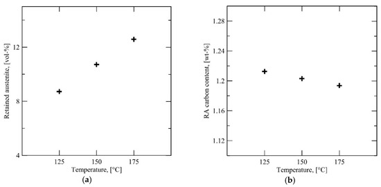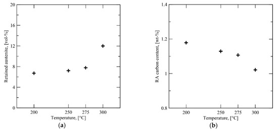Figure 8 and Figure 9 show the results of the XRD measurements and tensile tests for Steel B similar to Figure 6 and Figure 7. The behavior of Steel B differs from Steel A. Instead of a steady reduction in austenite fraction, there is an initially high amount (12 vol %) at QT = 300 °C followed by an appreciable drop at QT = 275 °C to a nearly stable austenite fraction (7–8 vol %) irrespective of further reduction in QT temperature down to 200 °C, Figure 8a. The corresponding average carbon content in retained austenite decreased from about 1.2% to 1% with an increase in QT from 200 to 300 °C, Figure 8b.