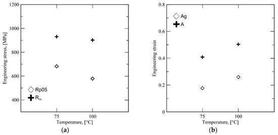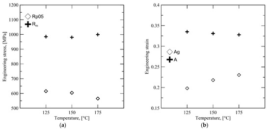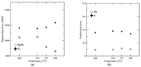 Figure 9 shows the results of the tensile property characterization of the Steel B specimens. Interestingly, there is a significant drop in yield strength beyond the QT > 250 °C. The low yield strength at QT = 300 °C is, however, accompanied by a high Rm of 1250 MPa, even though the Ag and total elongation A seem somewhat insensitive to the QT.