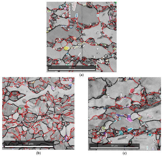 Figure 12 shows representative results of the EBSD measurements as band contrast maps overlaid with austenite grains (shown in random coloring). Prior austenite and packet boundaries were determined using a previously developed iterative reconstruction algorithm [8,27] and are shown in red (packet boundaries) and black (prior austenite grain (PAG) boundaries and ferrite boundaries).