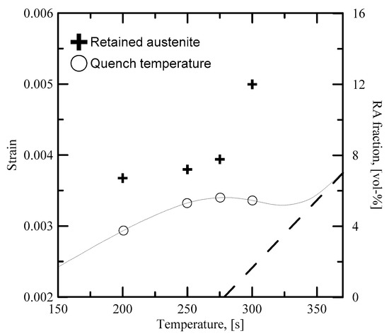 As shown by Figure 4b, there is much more austenite in the microstructure of Steel B after intercritical annealing compared to Steels A and C. This has two consequences—the average carbon content of the austenite is significantly lower (assuming total partitioning of carbon) and austenite grain size is higher. Both factors lower the critical driving force necessary for martensite nucleation, contributing to the rapid formation of martensite when lowering QT past 300 °C. It is possible that autocatalytic nucleation (“burst martensite” [28]) accelerates the rate of transformation. The rapid martensite formation is shown in Figure 13, which displays the retained austenite content with respect to QT overlaid with the dilatation curve in the temperature regime of the martensitic transformation.