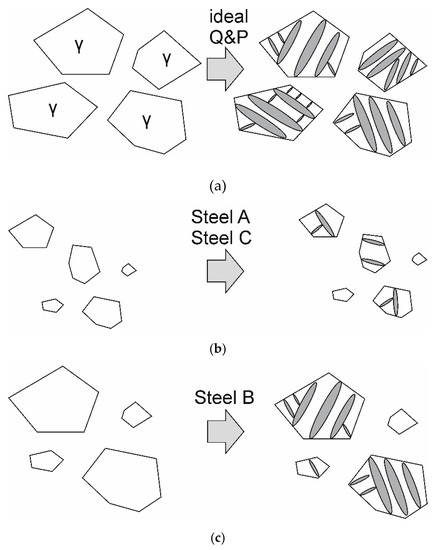 Austenite grains in a ferritic matrix partially transformed into martensite for (a) an ideal quenching and partitioning (Q&P) scenario, (b) the observed behavior of Steel A and Steel C and (c) the observed behavior of Steel B.