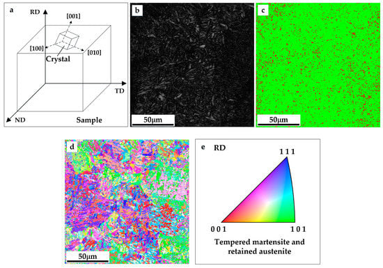 (a) Sample directions: RD represents rolling-direction, TD represents transverse-direction and ND represents normal-direction; (b) Scanning electron microscope (SEM) metallographic graph; (c) distribution of martensite and austenite grains, green area represents tempered martensite and red area represents retained austenite; (d) RD inverse pole figure; (e) color code map of the RD inverse pole figure.