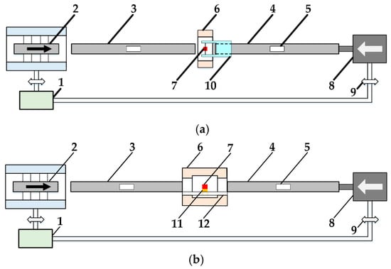 SHPB devices: (a) fine loading bars for Φ2 × 2 samples at high strain-rate; (b) coarse loading bars for Φ3 × 3 samples at low strain-rate. 1—air chamber; 2—strike bar; 3—incident bar; 4—transmission bar; 5—strain gauge; 6—furnace; 7—sample; 8—synchronous device; 9—valve; 10—clamping device; 11—heat insulation block; 12—guide rail.