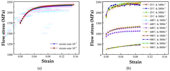 The dog-bone shape samples shown in Figure 3a are used for SHTB tests, and the tests are conducted at 1000 s−1 (25 °C) and 25 °C, 300 °C, 600 °C, 750 °C, 900 °C (500 s−1) respectively.