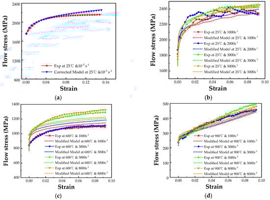 Comparison of experimental data and modified J-C model (a) quasi-static at 25 °C; (b) at different strain rate and 25 °C; (c) at different strain rate and 600 °C; (d) at different strain rate and 900 °C.