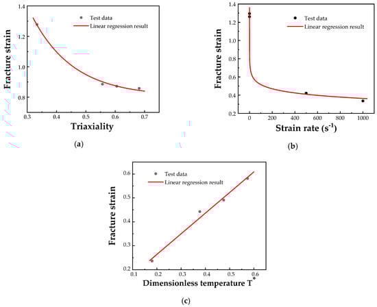 Step 1: For quasi-static tensile and notch sample tensile test at room temperature, the strain rate related term and the temperature related term in J-C damage model can be omitted. After logarithmic transformation, J-C damage model is given to Equation (12). Based on the data points of against triaxiality from quasi-static tensile and notch sample tensile tests at room temperature, D1, D2 and D3 in the stress triaxiality related term are fitted. The fitting result is shown in Figure 8a, and the fitted values are: with a fitting precision of 98.95%.