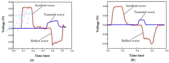 (a) Original wave signals in SHPB test; (b) original wave signals in SHTB test.