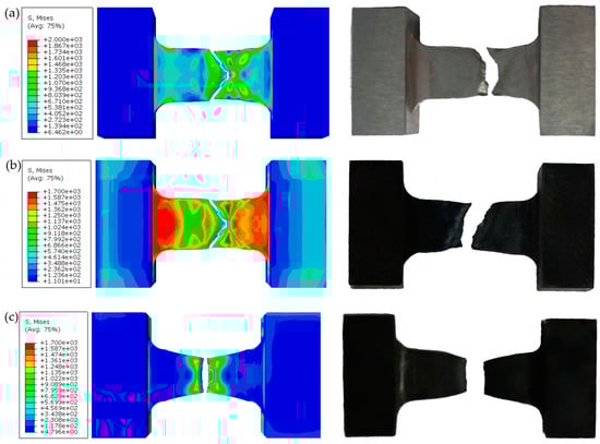 Fracture morphology in SHTB test and simulation at (a) 25 °C; (b) 600 °C; and (c) 900 °C.