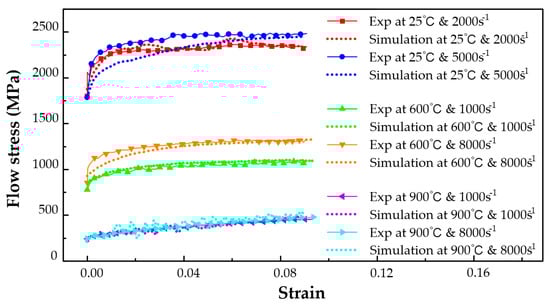 where is the temperature coupling coefficient and the strain coupling coefficient, respectively, is the coupling temperature and coupling strain. For 45CrNiMoVA material, By adding this coupled term, the fitted curves at room temperature and 600 °C are changed to some extent, but the strain hardening effect at 900 °C is perfectly taken into account, and the fitting accuracy R2 can reach as high as 99.53%. By comparing Figure 6 with Figure 7, a high degree of fitting between the modified J-C model and the experimental data is well manifested. But the fitted parameters in Table 4 shows very little changes from the J-C model to the modified J-C model, so the increase in fitting accuracy is owed to the added two terms.