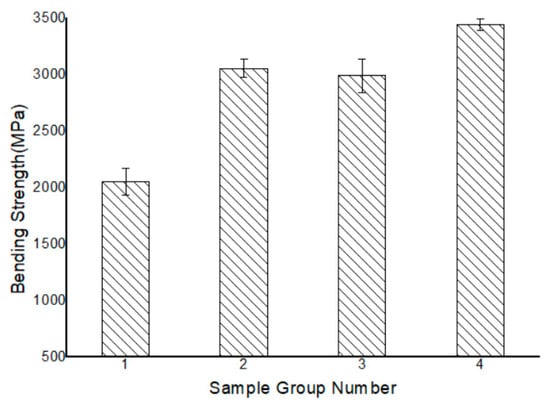 Using the bending strength tester, the bending strength of the sample was measured by a three-point test method. When carrying out the test, the midpoint of the samples must be set right in the middle of the two fulcrums. In order to ensure the accuracy of the test, the loading rod was at a speed of 600 N/s. The bending strength was calculated using the following formula: