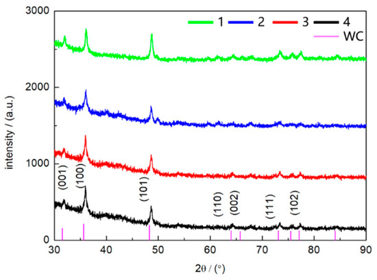 In order to show the consistency of microstructures more practically and comprehensively, X-ray diffraction was used to explore the microstructures. The results can be seen as Figure 7. The microstructures of the four samples were in good agreement with the diffraction peaks of WC. This meant that, despite the addition of graphene and carbon nanotubes, the microstructure of cemented carbide matrix remained stable without any visible changes. The consistency of the microstructures was further confirmed.