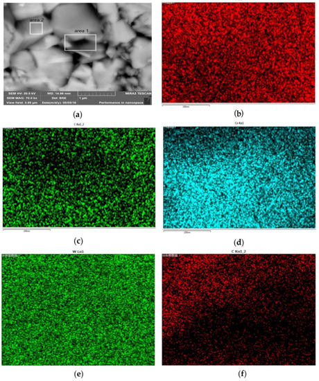 (a) Image of areas used for EDS analysis; (b) distribution of W content in area 1; (c) distribution of Co content in area 1; (d) distribution of C content in area 1; (e) distribution of W content in area 2; (f) distribution of C content in area 2.