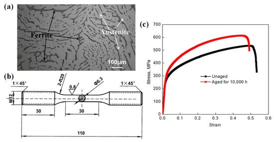 - Yamada, T.; Okano, S.; Kuwano, H. Mechanical property and microstructural change by thermal aging of SCS14A cast duplex stainless steel. J. Nucl. Mater. 2006, 350, 47–55. [Google Scholar] [CrossRef]