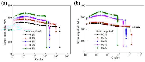 Figure 2. The variation of the stress amplitude of the material under cyclic loading can be divided into four stages: (1) The cyclic hardening stage, where the stress amplitude rapidly rises to the maximum stress amplitude in the first few cycles; (2) the slow cyclic softening stage, where the material begins to soften once the maximum stress amplitude was reached; (3) the cyclic saturation stage, where the stress amplitudes stay unchanged with cycles; (4) the rapid softening stage, where the material softens and eventually fractures. The cyclic stress response characteristics of the unaged and aged materials were closely related to the strain amplitude. Under low strain amplitude, cyclic softening occurred after initial short cyclic hardening, followed by the cyclic saturation stage, which accounted for more than half of the total life. While the cyclic saturation stage was much shorter under high strain amplitude, the cycle softening stage accounted for more than half of the total life. Compared with the unaged materials, the degree of cyclic hardening and softening of the aged materials was more pronounced, and the proportion of the cycle hardening stage in the total life was higher.