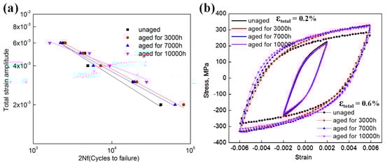 Figure 3a shows the variation of fatigue life with strain amplitude for the CDSS unaged and aged at 400 °C for 3000, 7000, and 10,000 h. For the same thermal aging state, the LCF life of the material decreased linearly with increasing strain amplitude. The stable hysteresis loops under 0.2 and 0.6% strain amplitudes (at half of the fatigue life) of specimens with different aging states are shown in
