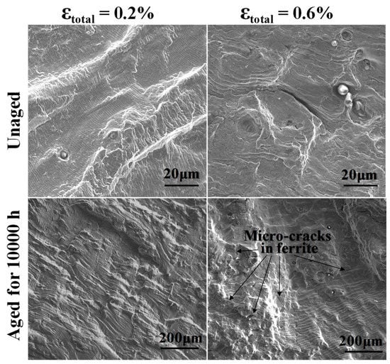 Figure 4. Both the ferritic and austenitic phases displayed fatigue fringes on the fatigue fracture surfaces of the fatigue crack growth regions in unaged CDSS under a strain amplitude of 0.2%, and the two phases could not be distinguished from each other. When the strain amplitude increased to 0.6%, the fatigue fringe spacing of the unaged CDSS significantly broadens. The fatigue fracture morphologies of CDSS after thermal aging for 10,000 h were significantly different from the unaged. The ferritic and austenitic phases on the fatigue fracture surface display different characteristics, and the fatigue fringes mainly appear in austenite. The fatigue fringes in the austenite of the aged CDSS under 0.6% strain amplitude were denser than those in the unaged material. Brittle cleavage characteristics and micro-cracks in ferrite were observed on the fracture surface of the aged CDSS under 0.6% strain amplitude. The micro-cracks in ferrite of the aged CDSS led to a significant decrease in fatigue life.