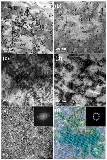 Figure 5f shows the corresponding orientation distribution of the HRTEM image, indicating that ferrite in the aged CDSS was divided into nanoscale regions with different orientations after deformation. These regions have a similar dimension as the Cr-enriched and Cr-depleted domains in ferrite induced by spinodal decomposition during thermal aging.