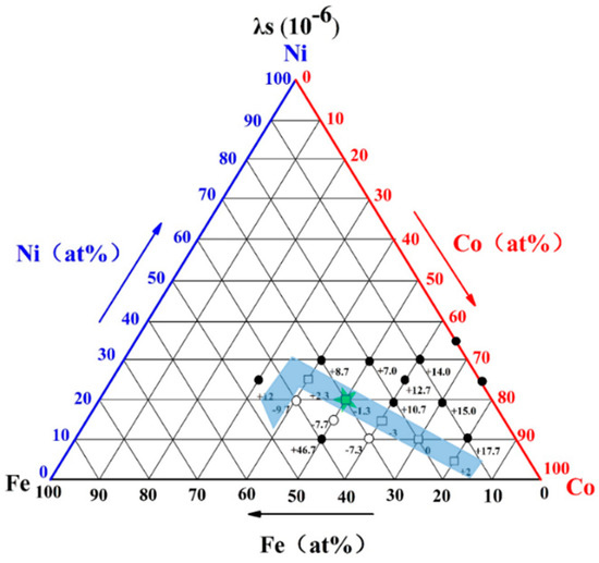 The saturation magnetostriction (λs) of the Co-Fe-Ni bulk ternary alloys at room temperature.