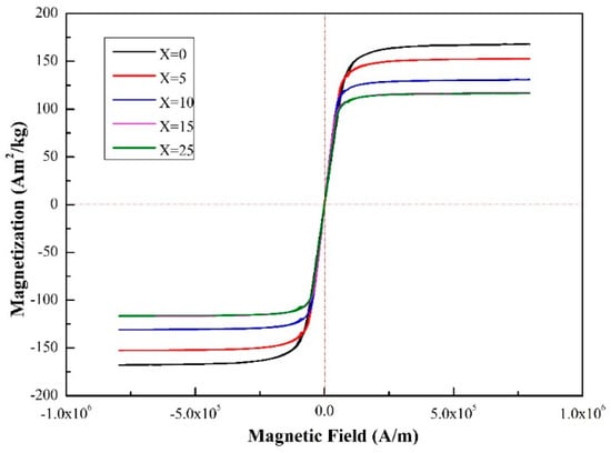 The hysteresis loops of (Fe0.3Co0.5Ni0.2)100−X(Al1/3Si2/3)X HEAs at room temperature.