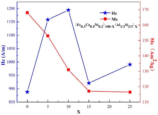 The variation of the coercivity (Hc) and saturation magnetization (Ms) are shown in Figure 4. When X ≤ 10, the alloys maintain the FCC structure, and the coercivity increases with increasing Al and Si contents, increasing from 888 A/m to 1194 A/m. With higher Al and Si contents, the alloys become BCC dominant, and the Hc drops to 921 A/m when X = 15 but increases to 990 A/m when X = 25. Within a specific crystal structure, increasing Al and Si contents increase the atomic size difference and hence lattice distortion and coercivity.