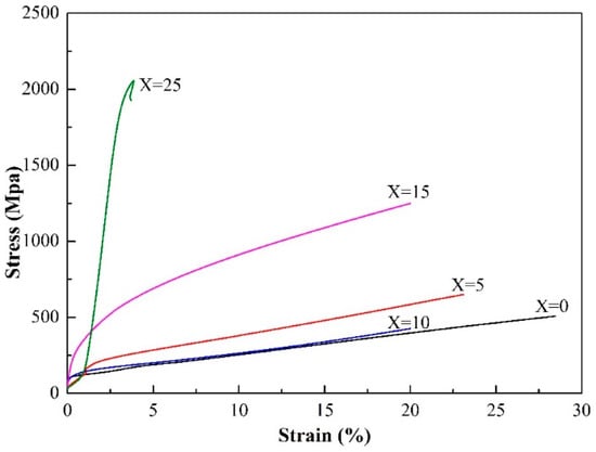 The compressive stress-strain curves of (Fe0.3Co0.5Ni0.2)100−X(Al1/3Si2/3)X HEAs at room temperature.