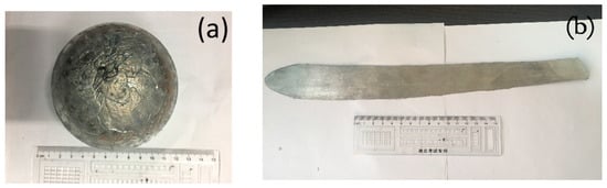 The macroscopic appearance: (a) (Fe0.3Co0.5Ni0.2)95(Al1/3Si2/3)5 alloy ingot prepared by maglev melting, (b) cold-rolled sheet.