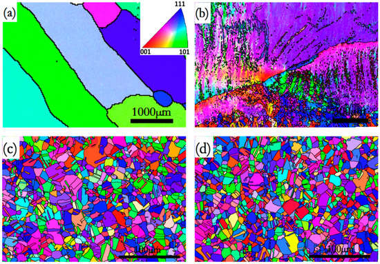 Electron backscatter diffraction (EBSD) images of the (Fe0.3Co0.5Ni0.2)95(Al1/3Si2/3)5 alloy: (a) as-cast, (b) cold rolling, (c) water quenching, and (d) furnace cooling after annealing at 1000 °C.