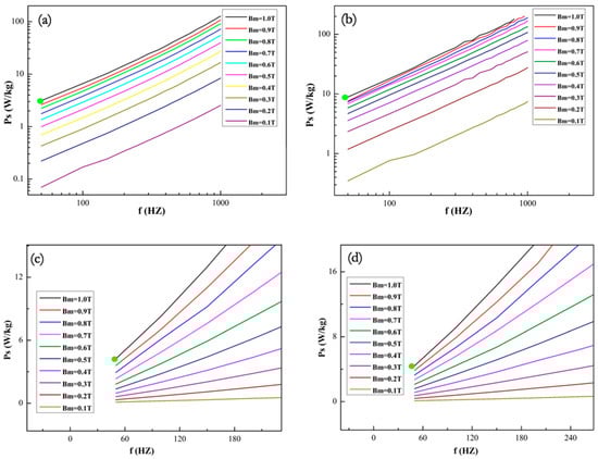Power loss curves of the (Fe0.3Co0.5Ni0.2)95(Al1/3Si2/3)5 alloy: (a) as-cast, (b) cold rolled, (c) water quenching, and (d) furnace cooling after annealing at 1000 °C.