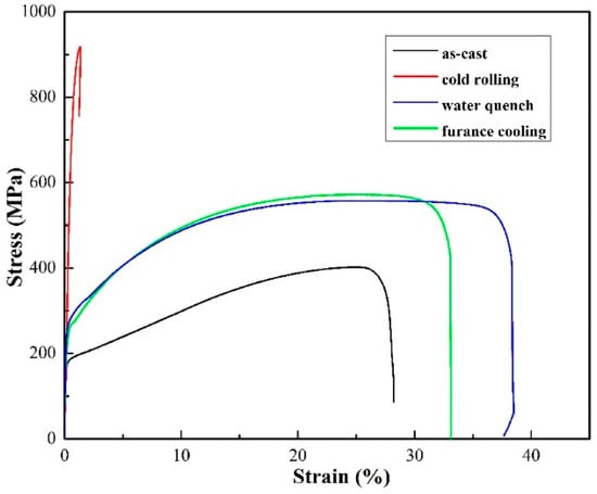 Tensile stress-strain curves of the (Fe0.3Co0.5Ni0.2)95(Al1/3Si2/3)5 alloys in the as-cast, cold rolling and annealed states.