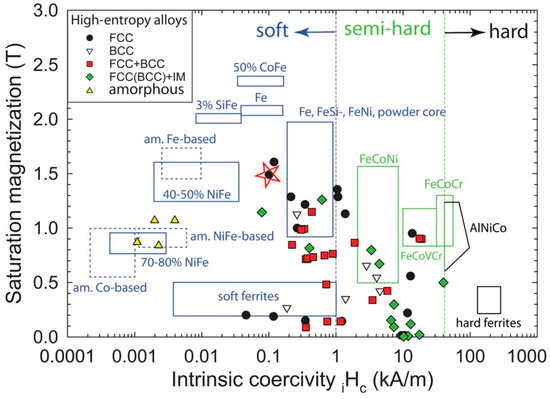 The saturation magnetization and intrinsic coercivity of the ((Fe0.3Co0.5Ni0.2)95(Al1/3Si2/3)5 alloy (marked by the red star) compared with other HEAs, amorphous metals and commercialized soft magnets compiled by Gao et al. Reproduced from [40] with permission of Cambridge University Press.