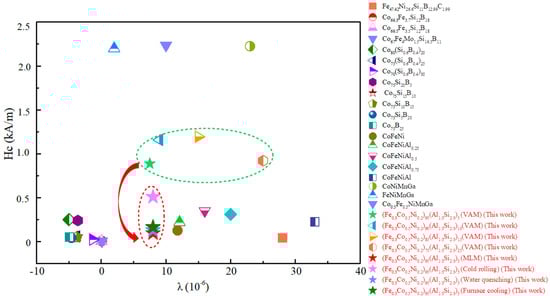 The relationship between saturation magnetostrictive coefficient and coercivity of amorphous alloys and HEAs (data from [46,47,49,50,51,52]).