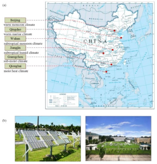 (a) The geographical distribution and climate types of 6 test stations; (b) the on-site pictures of exposure test.